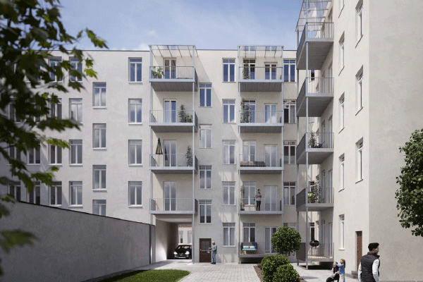 Auf dem ruhigen Innenhof befinden sich Fahrrad- und PKW-Stellplätze. Zum ruhigen Innenhof wird eine Balkonanlage errichtet.