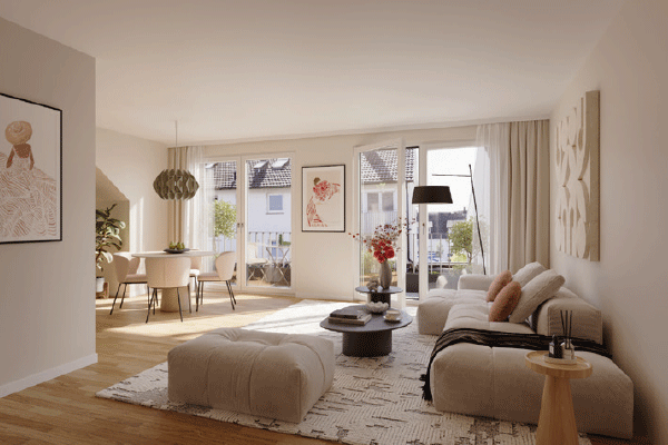 Alle Wohnungen verfügen über eine hochwertige Ausstattung mit Balkonen oder Terrassen, während großzügige und teilweisebodentiefe Fensterflächen eine lichtdurchflutete Wohnatmosphäre schaffen.